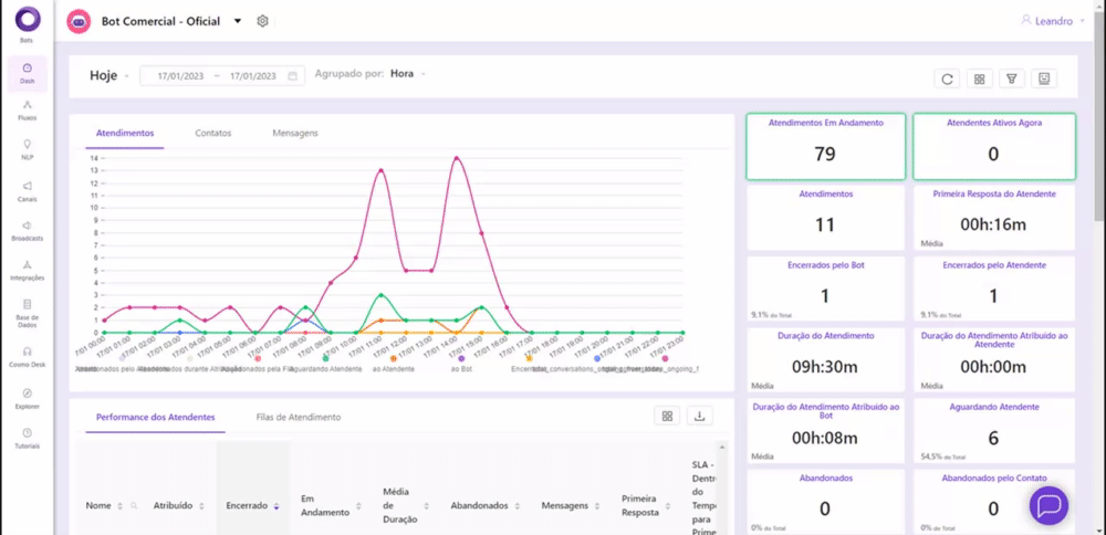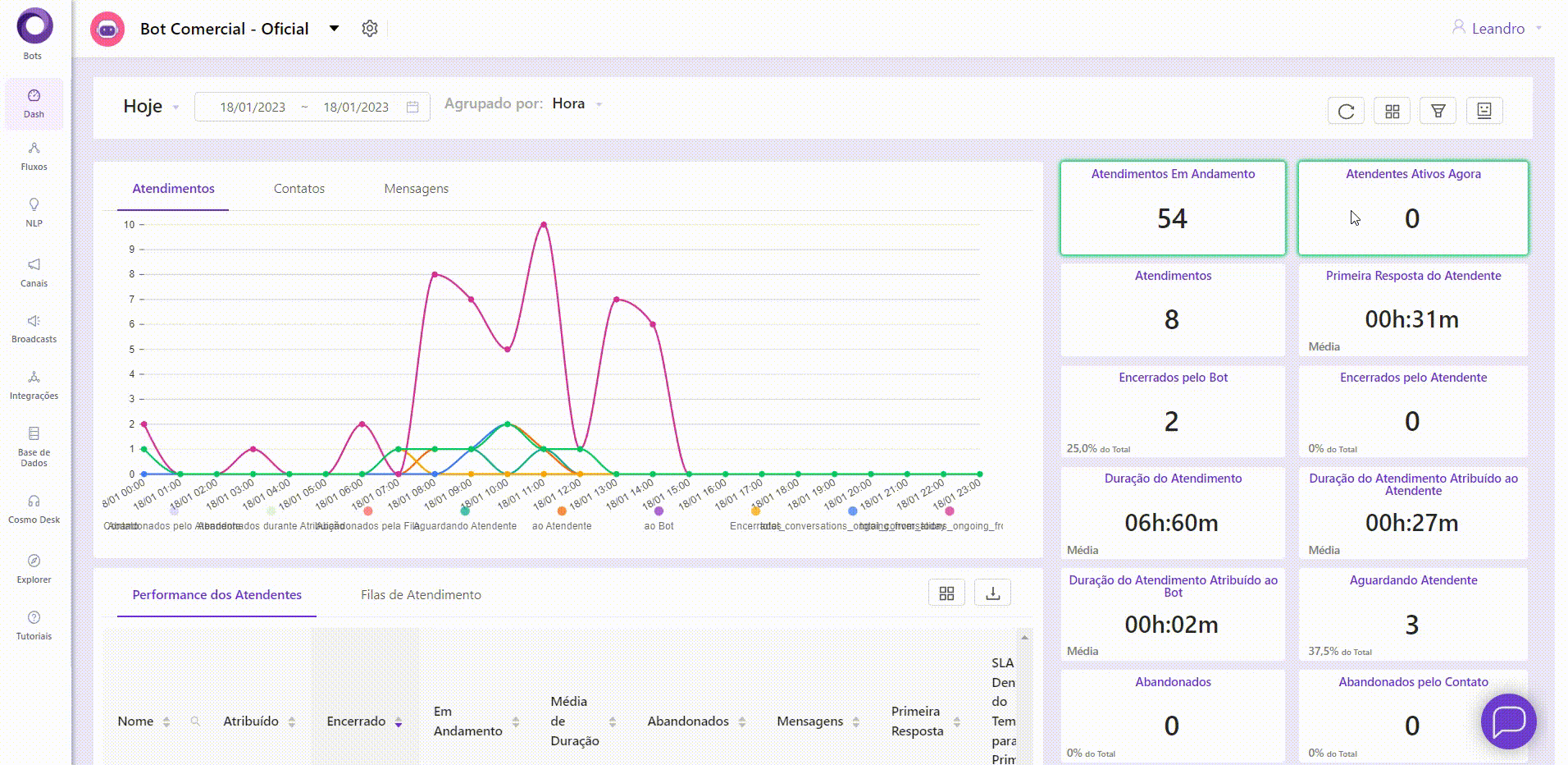 OBS#: Lembrando que o Dashboard traz os dados gerais da ferramenta, caso você queira informações detalhadas de cada usuário que entrou, você consegue puxar esses dados em [Base de dados](https://help.cosmobots.io/help/bot-builder/dados).